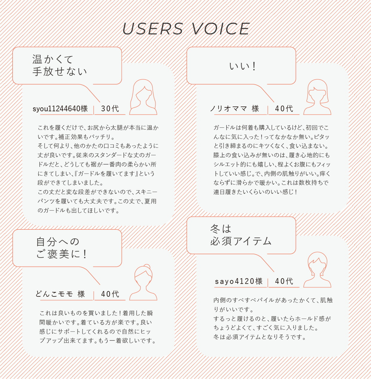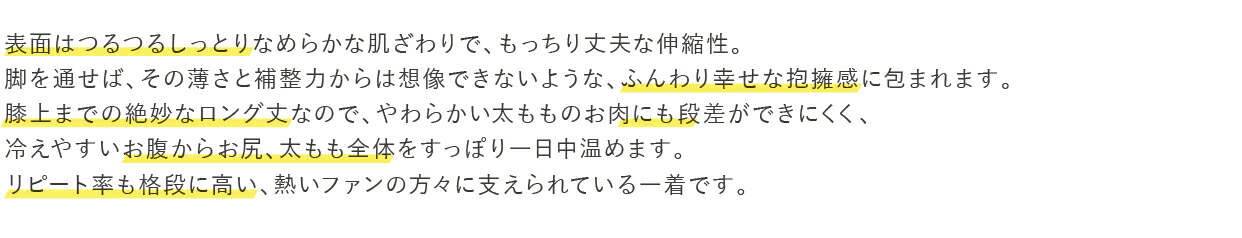 数年前に店舗利用してガードルが良かったので又久しぶりに温かいガードル欲しくて購入しました。温活とスタイル維持の目的でした。ガードル特有のサイズや生地の感覚、温かみなど些細な部分を心配していましたが試着したら外生地つるつる毛玉など出来にくそうですし、内側温かい生地もごわつくことなかれ ふんわり温かく締める部位は適度に締め感ありでハイウエスト部分のゴムは程よく商品購入して良かったです