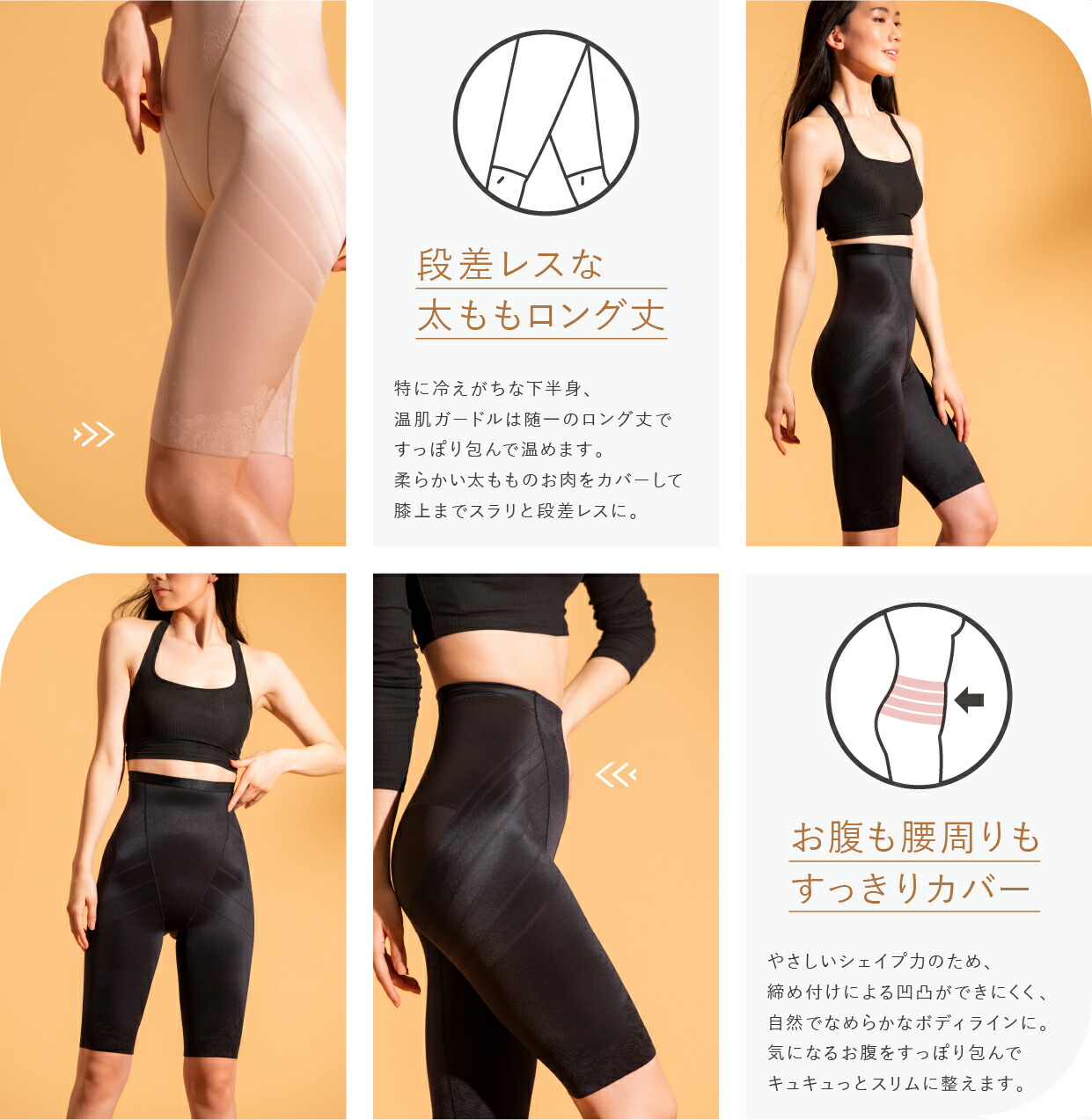 丈の長さがちょうど良く、膝上のニクも包んでくれるのでタイトパンツ履いてもシルエットがキレイに見えます。他社設計のガードルだと丈が中途半端で膝上のニクが中途半端に「むにゅ」っと収まらないので、こちらは優れものです。リピ買いしました!