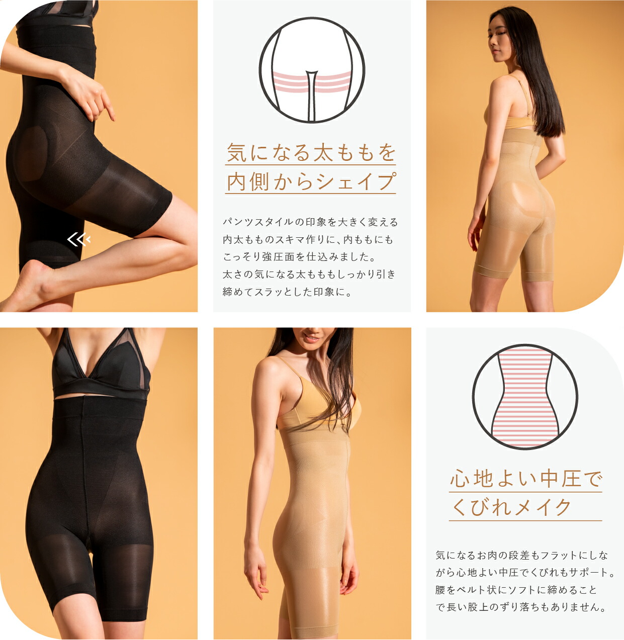 締め付け(特にお腹周り)が大嫌いで、すぐ気分が悪くなるのですが、この商品は大丈夫そうです!とは言ってもちゃんと太ももやお尻腰回りはupされてる感じしますし、ウエストもくびれます!