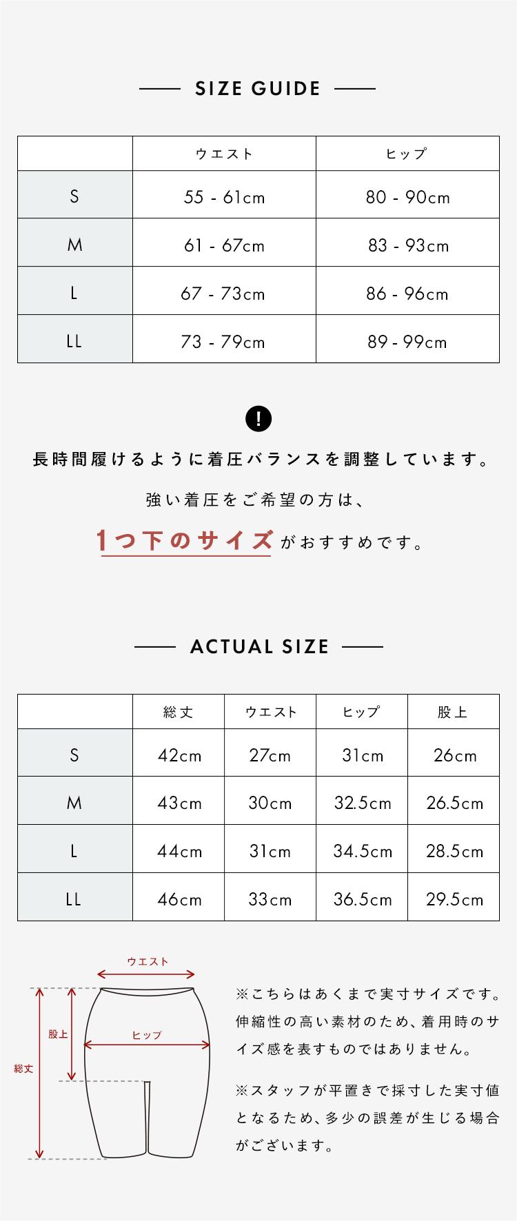 Lサイズだと膝上の部分がピチッと締め付けないので、前回Mサイズにサイズダウンしたところとてもいい感じに引き締めてくれてるのでリピ買いしました。
