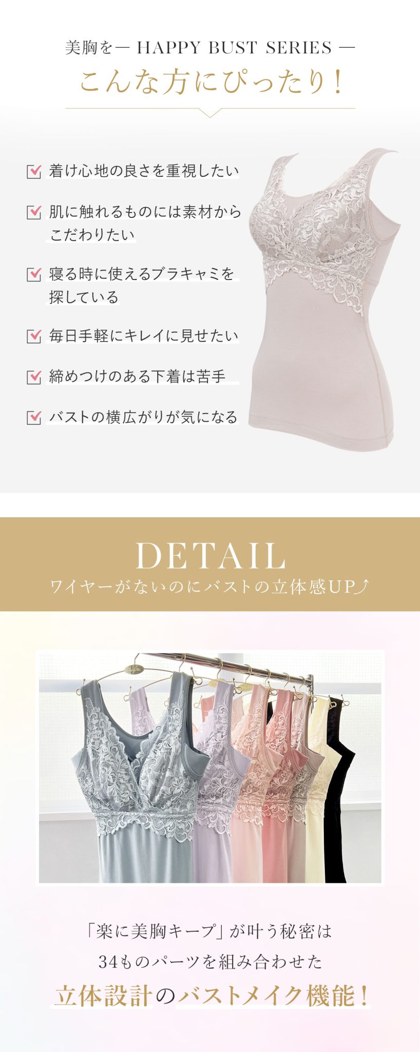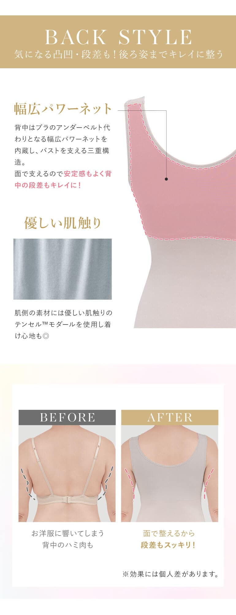 | ショルダー | 幅広のタンクトップ型ショルダーで、食い込みにくく優しい肌触りです。 |