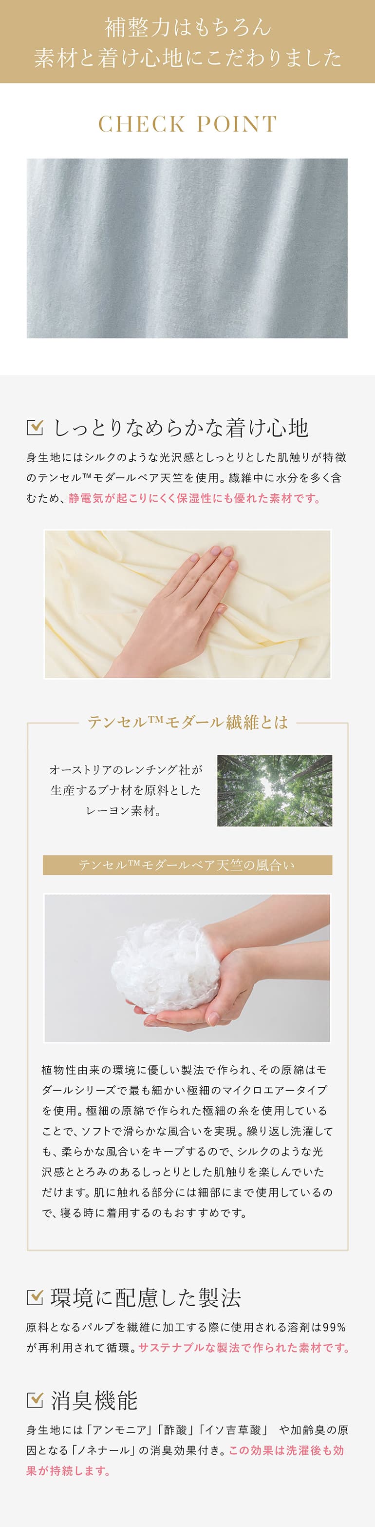 | 身生地 | 保湿性に優れ乾燥しにくく、ソフトでなめらかな風合いが特徴のテンセル™モダール繊維です。植物由来の環境に優しい製法で作られたサステナブルな素材です。(テンセル™モダールベア天竺の混用率:レーヨン90%・ポリウレタン10%) |