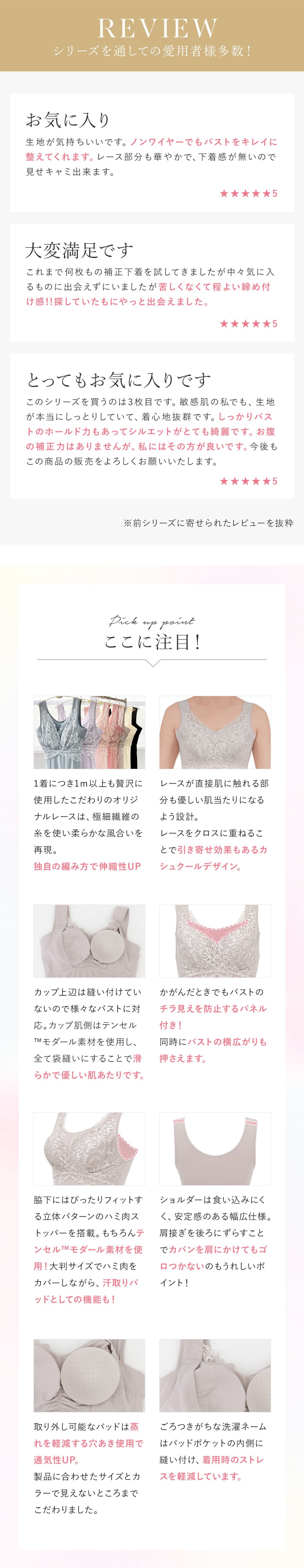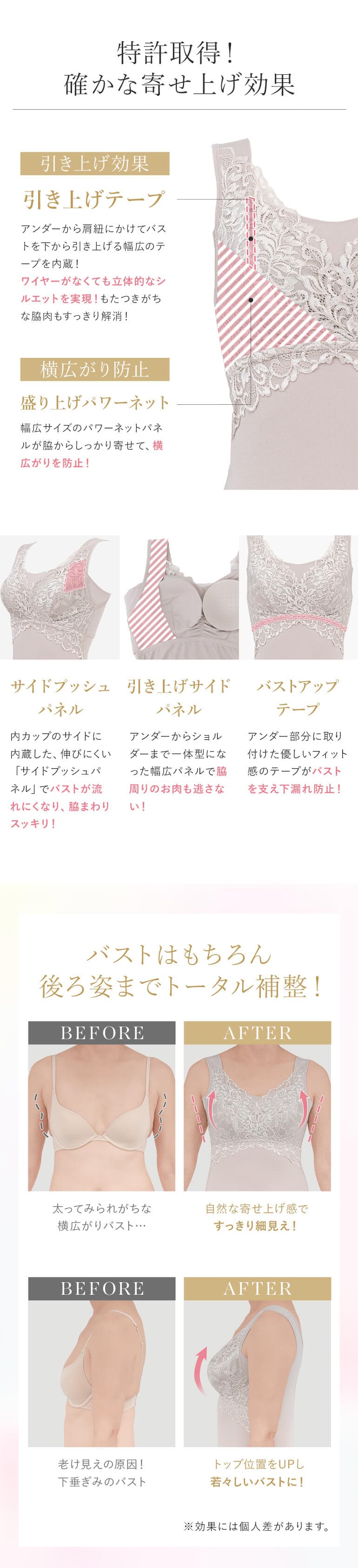 | 胸元 | バストの丸みを潰さずフィットする立体設計。独自の補整機能を施し、楽な着心地とバストアップ機能を両立します。 |