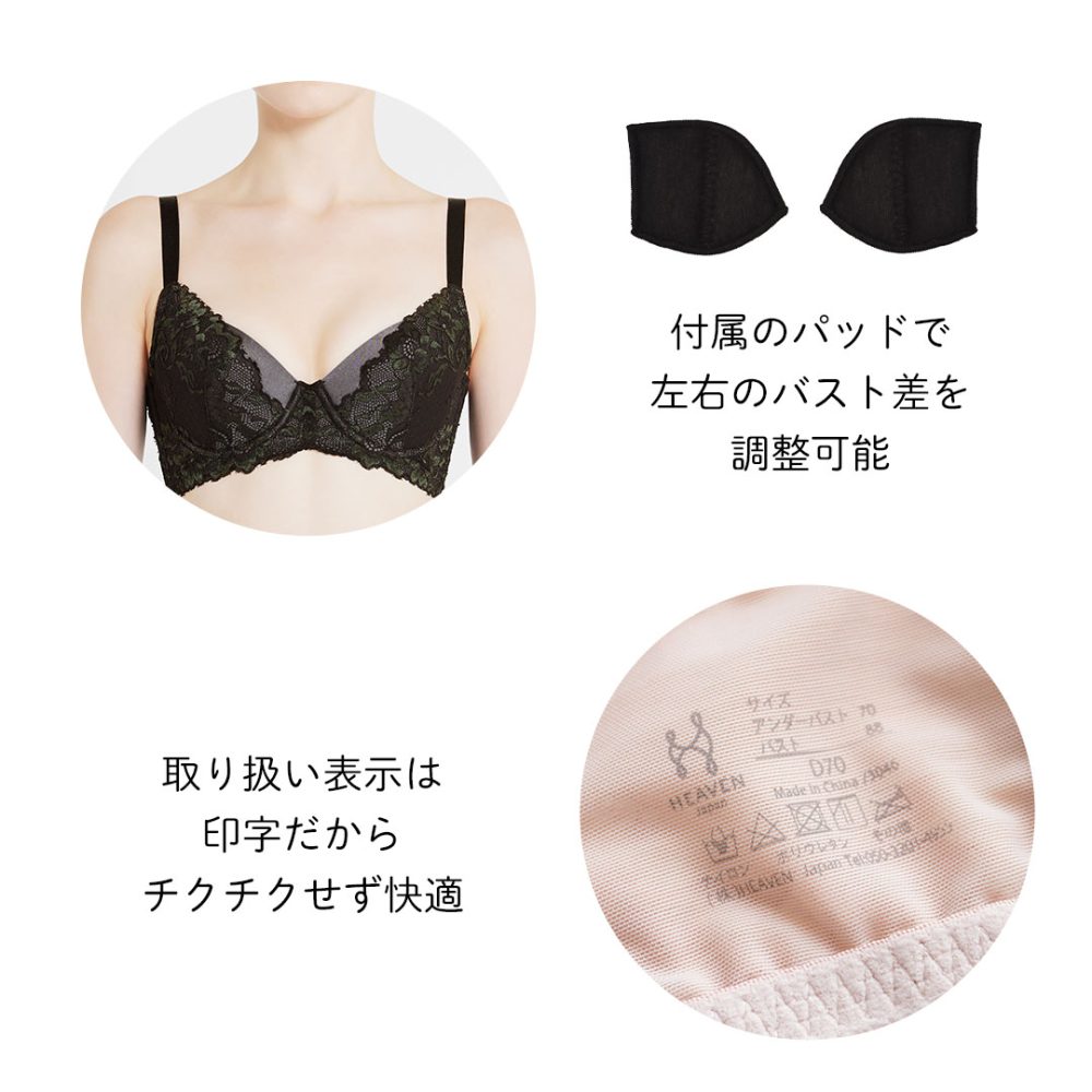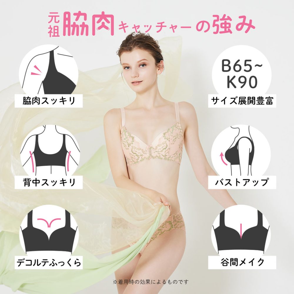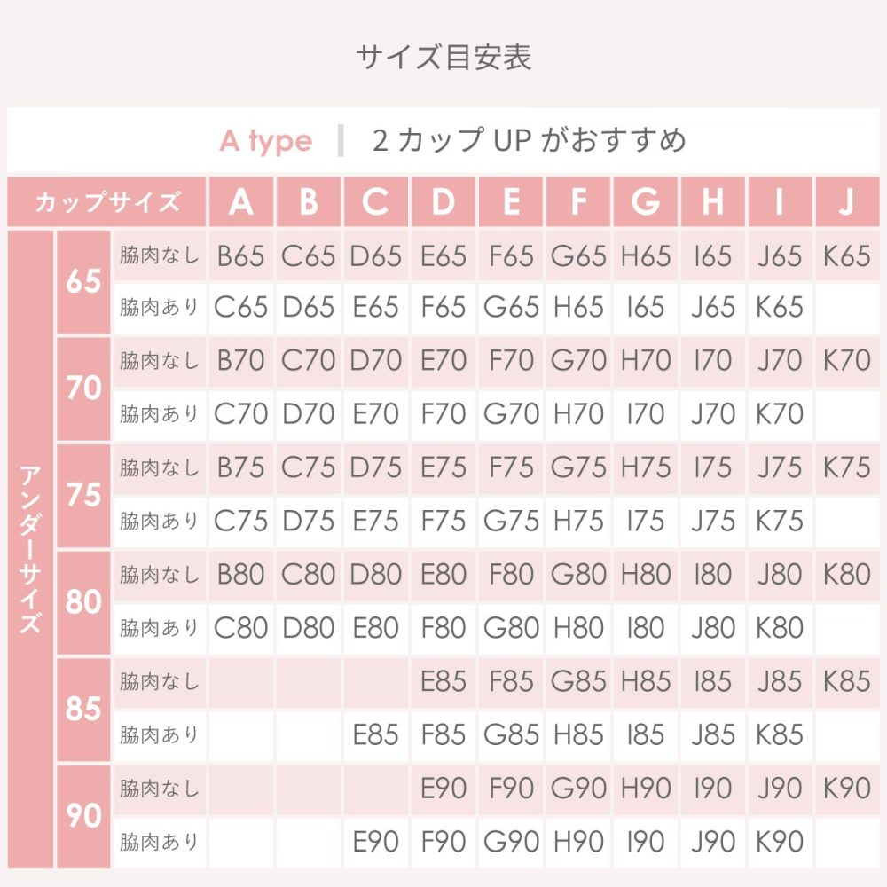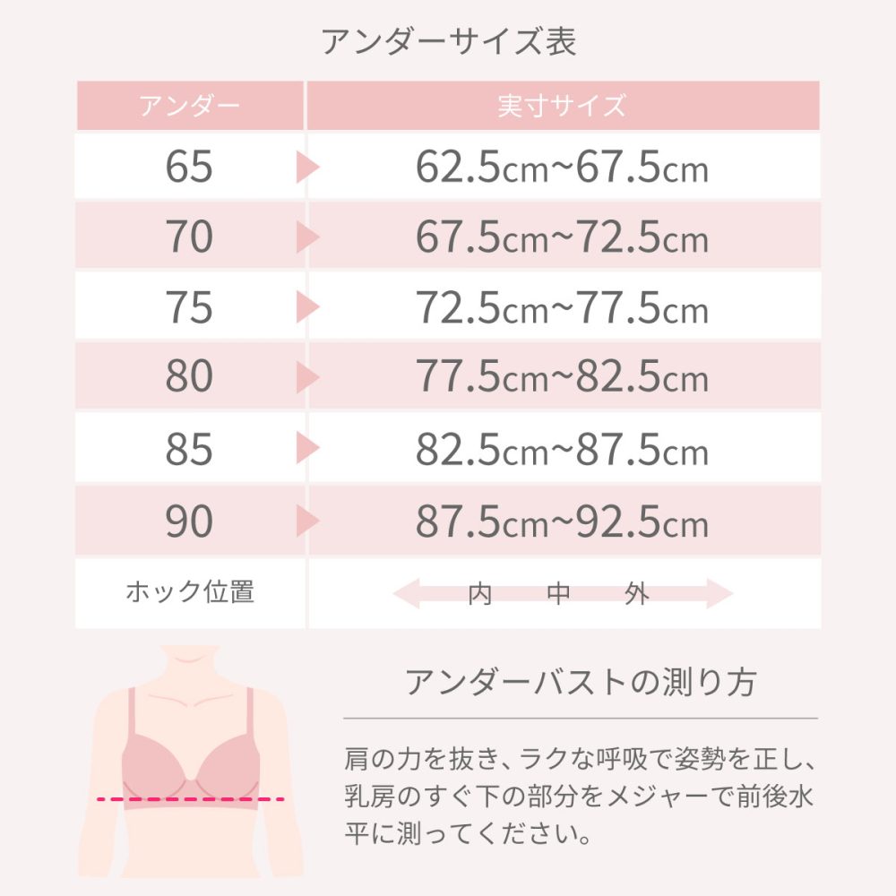 | サイズ | B65, B70, B75, B80, C65, C70, C75, C80, D65, D70, D75, D80, E65, E70, E75, E80, E85, E90, F65, F70, F75, F80, F85, F90, G65, G70, G75, G80, G85, G90, H65, H70, H75, H80, H85, H90 |