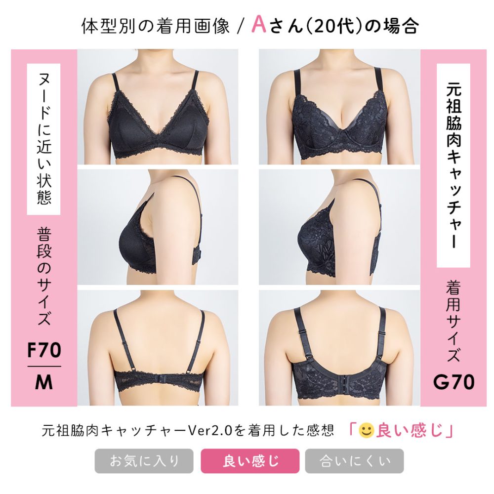2年ぶり位に元祖脇肉キャッチャーを購入しました。胸は小さいのに脇の周りはポチャポチャなので、腕を動かすとやはりお肉は逃げてしまいますが、このブラジャーでないともっとそうなるので、多分このままお世話になると思います。